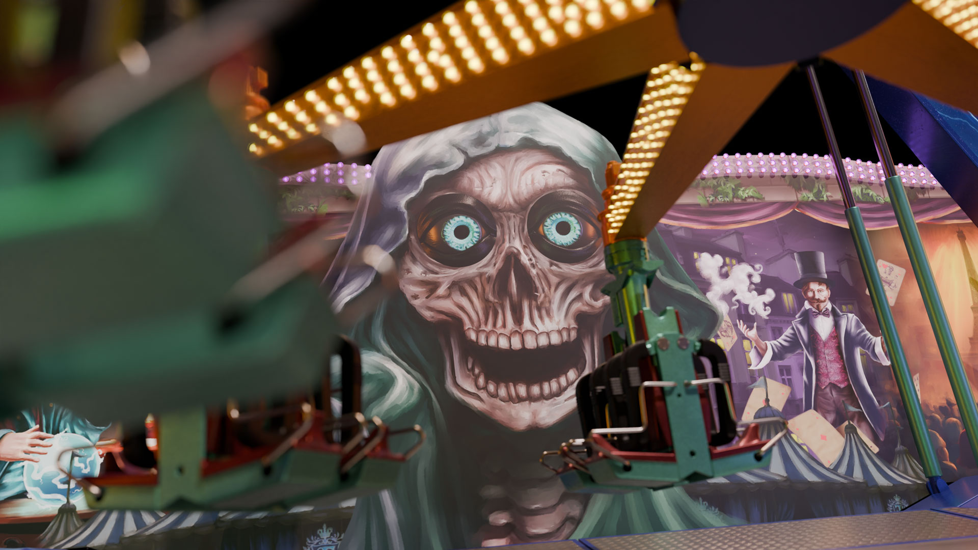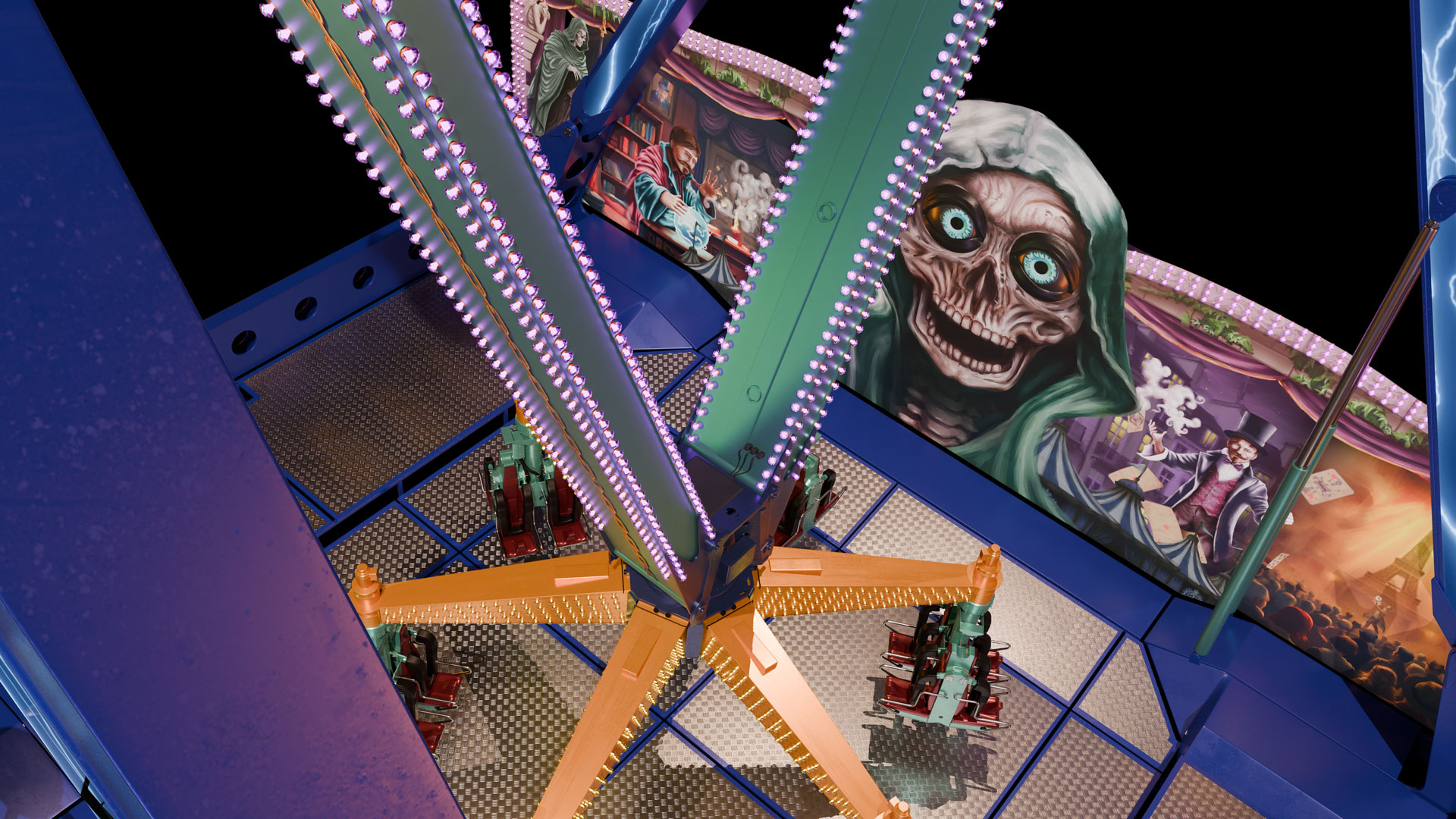 In die Rückwand des Fahrgeschäfts ist eine fesselnde, animierte Darstellung des Todes integriert: ein klassischer Sensemann – doch mit einem entscheidenden Detail: Seine Augen sind interaktiv und folgen der Gondel. Auch für alle Zuschauer ein absoluter Hingucker.