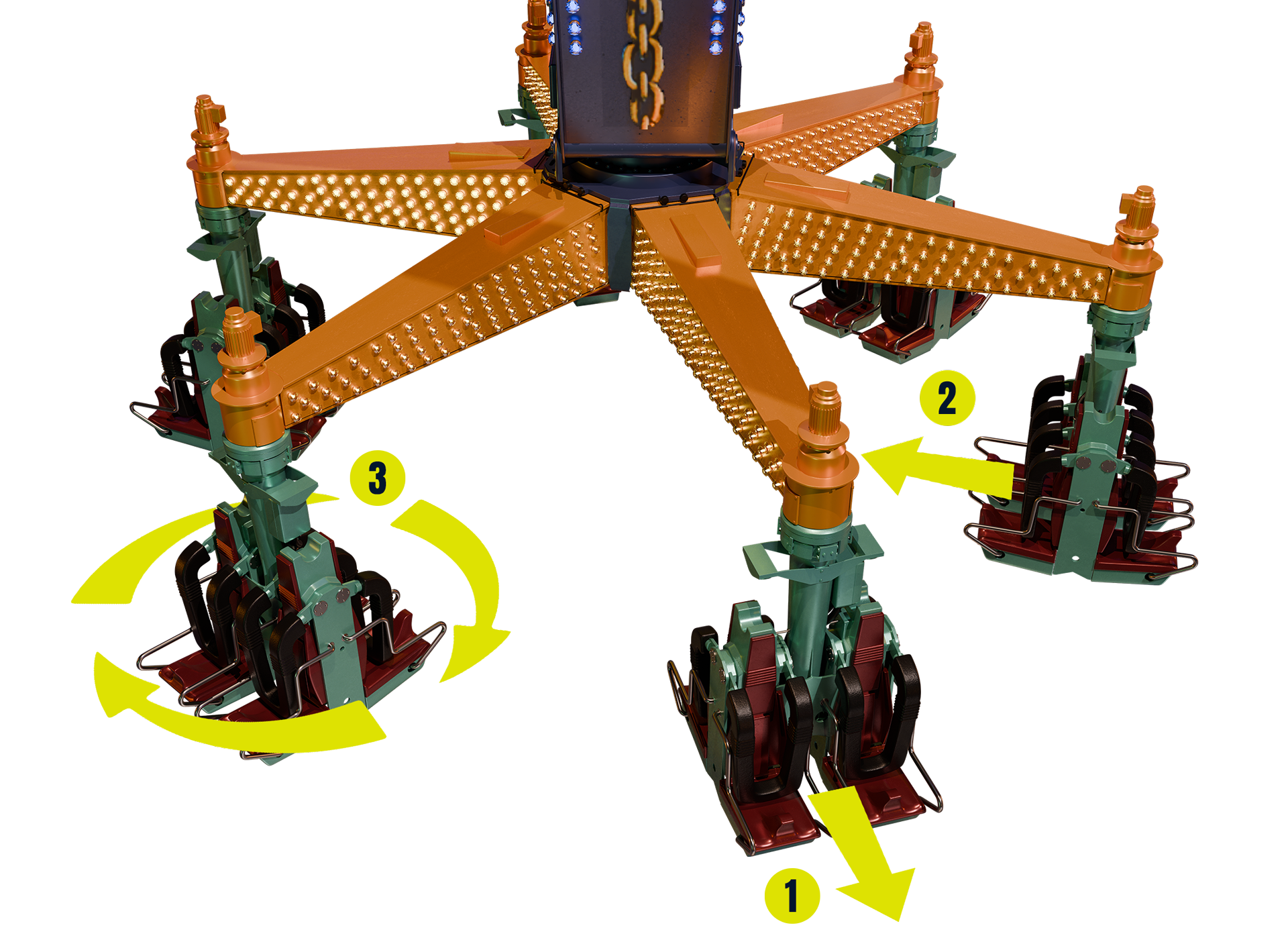 Dank einer voll integrierten, professionellen Live-Lichtsteuerung ist jede einzelne Leuchte des gesamten Fahrgeschäfts individuell und in Echtzeit steuerbar. Jede Farbe, jeder Effekt, jede Helligkeit – punktgenau, live und synchron zur Fahrt.